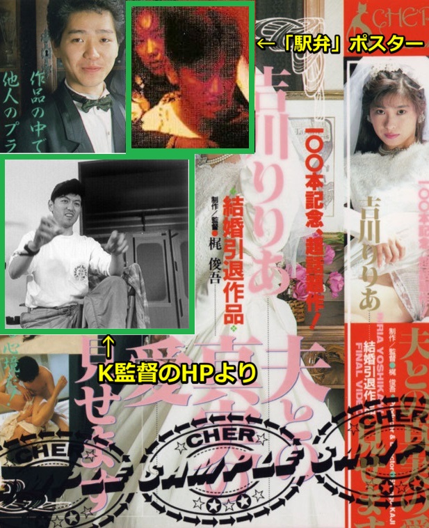 下記の画像は引退作のパッケージ画像(制作元であるCherレーベルのマーキング付き公式サンプル画像)にK氏の数枚の画像を重ねた顔の比較です。ちなみに重ね合せたのは監督本人のホームページにあるものと、K氏が監督として指揮を執るとともに男優として出演した名作「駅弁」の宣伝用画像です。撮影時期は違うと考えられますが、よく似ていると思いませんか。